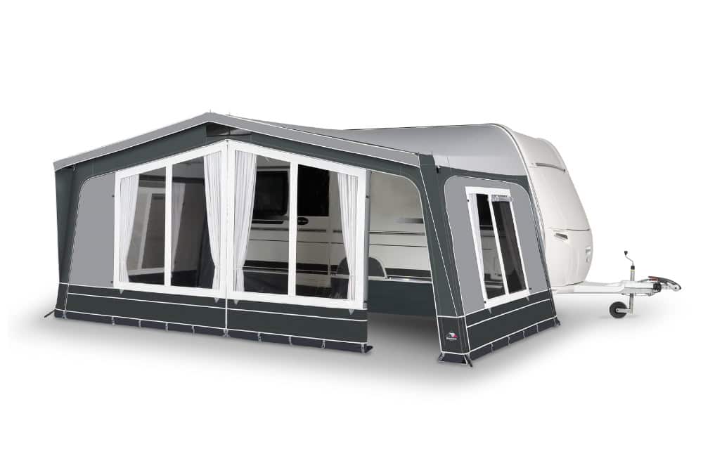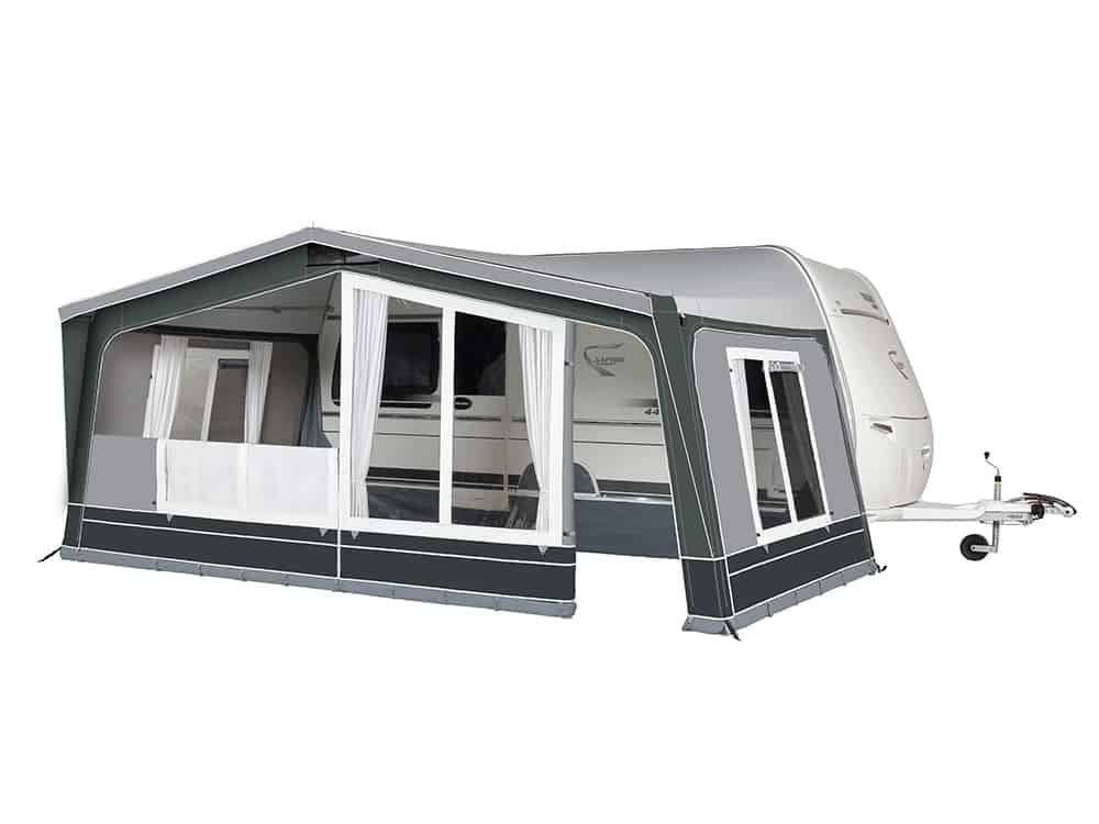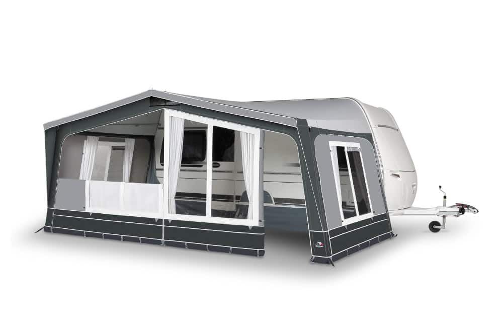 De Dorema Emerald 270: Geslepen tot in perfectie. Deze voortent is uitgerust met ventilatiemogelijkheden in de nok en in de linker- en rechterzijwand. Tevens zijn zowel de zijwanden als de voorwanden volledig afritsbaar en het heeft een strak ontwerp gecombineerd met zorgvuldig geselecteerde stoffen. De strakke witte gordijnen met subtiele details maken dit model helemaal compleet. Standaard wordt de Dorema Emerald 270 geleverd met een tochtstrook voorzien van een wielflap, gordijnen, haringen, een handige opbergzak en een duidelijke gebruiksaanwijzing.