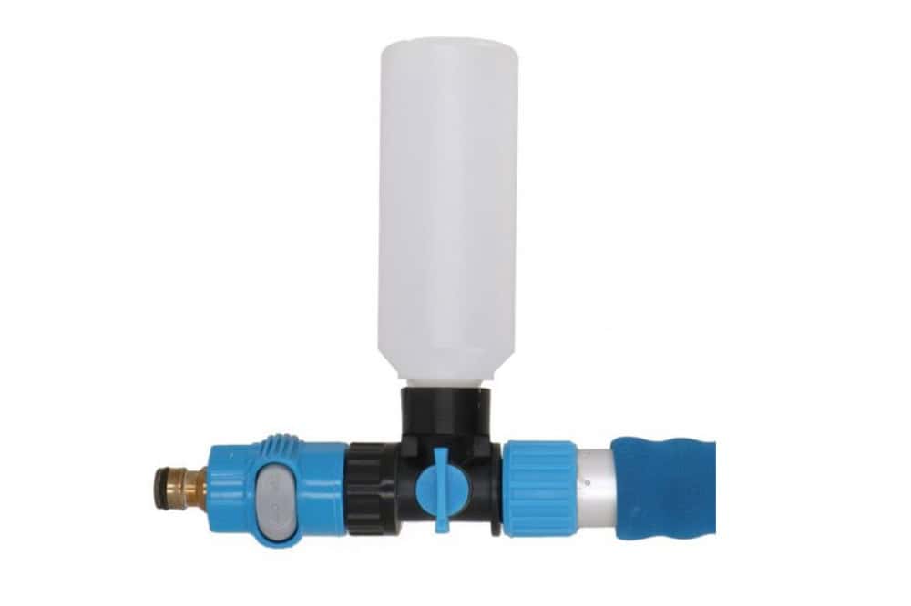 De aluminium steel maakt de borstel licht en stevig tegelijk. Tijdens het wassen buigt hij niet door, en na gebruik schuift u hem compact in. Sluit de borstel aan op het water en meng de Mestic shampoo direct met de regelaar op de steel – zo heeft u altijd het perfecte sopmengsel bij de hand.