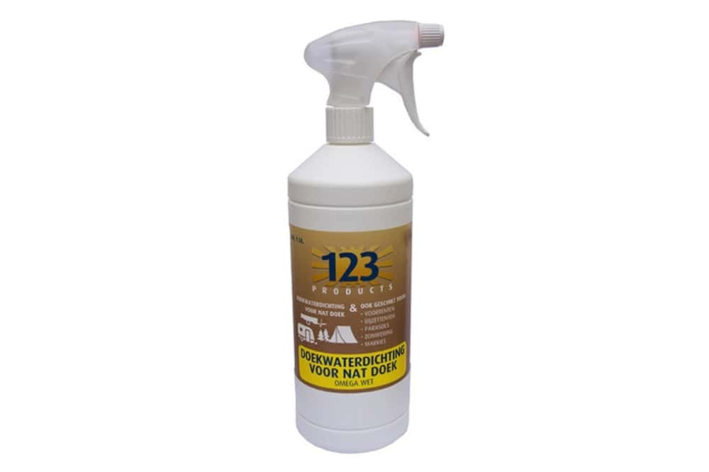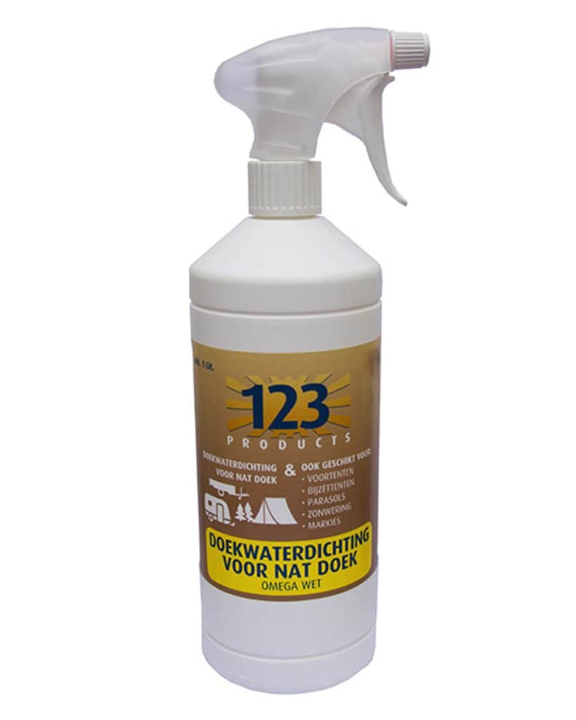 Omega WET is een waterdichtingsmiddel geschikt voor de meeste soorten NAT doek, of het nu na een schoonmaakbeurt is of bij acute lekkage. In het geval van acute lekkage, wacht eerst tot het ophoudt met regenen en impregneer dan snel. Het product heeft ongeveer 30 minuten nodig om aan te drogen. Met deze flacon kunt u met de bijgeleverde sprayer ongeveer 15m² impregneren. Omega WET dringt diep door in de vezels van het te impregneren materiaal en maakt het doek weer jarenlang waterdicht. Voor gebruik van Omega Wet, borstel het doek grondig af met de droge 123 Tentdoekborstel. Als het doek zeer vuil is, gebruik dan de Alpha Tentdoekreiniger. Breng het product direct na het reinigen aan op het nog natte doek; kunstmatig nat maken wordt afgeraden. Bij een gecoat dak, werk altijd van binnen naar buiten; voor de rest van het doek is eigen inzicht van toepassing. Behandel beide zijden indien nodig. Breng Omega WET dun aan op het oppervlak en werk vlak voor vlak. Zorg ervoor dat het doek niet doordrenkt raakt; twee dunne lagen werken beter. Ruim het doek pas op wanneer het volledig droog is, laat het minimaal 24/36 uur drogen. Als Omega WET op de ramen terechtkomt, veeg dit dan direct weg met een tissue of doekje. Dit product is ook geschikt voor voortenten, bijzettenten, parasols, zonwering en markiezen. Het is onbeperkt houdbaar bij vorstvrije opslag. Tip: Voor lekkende naden, gebruik de 123 Seale Nadendicht.