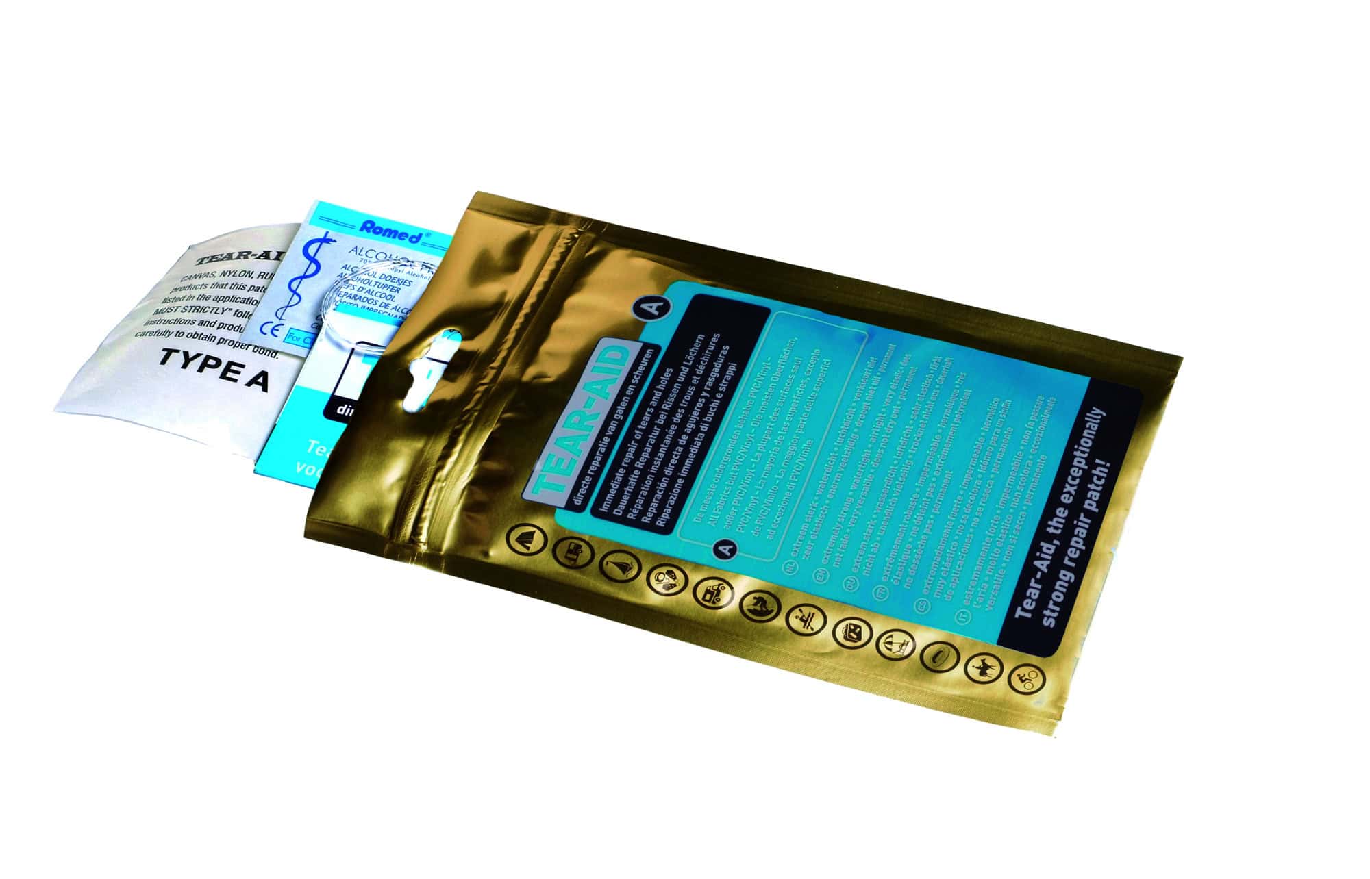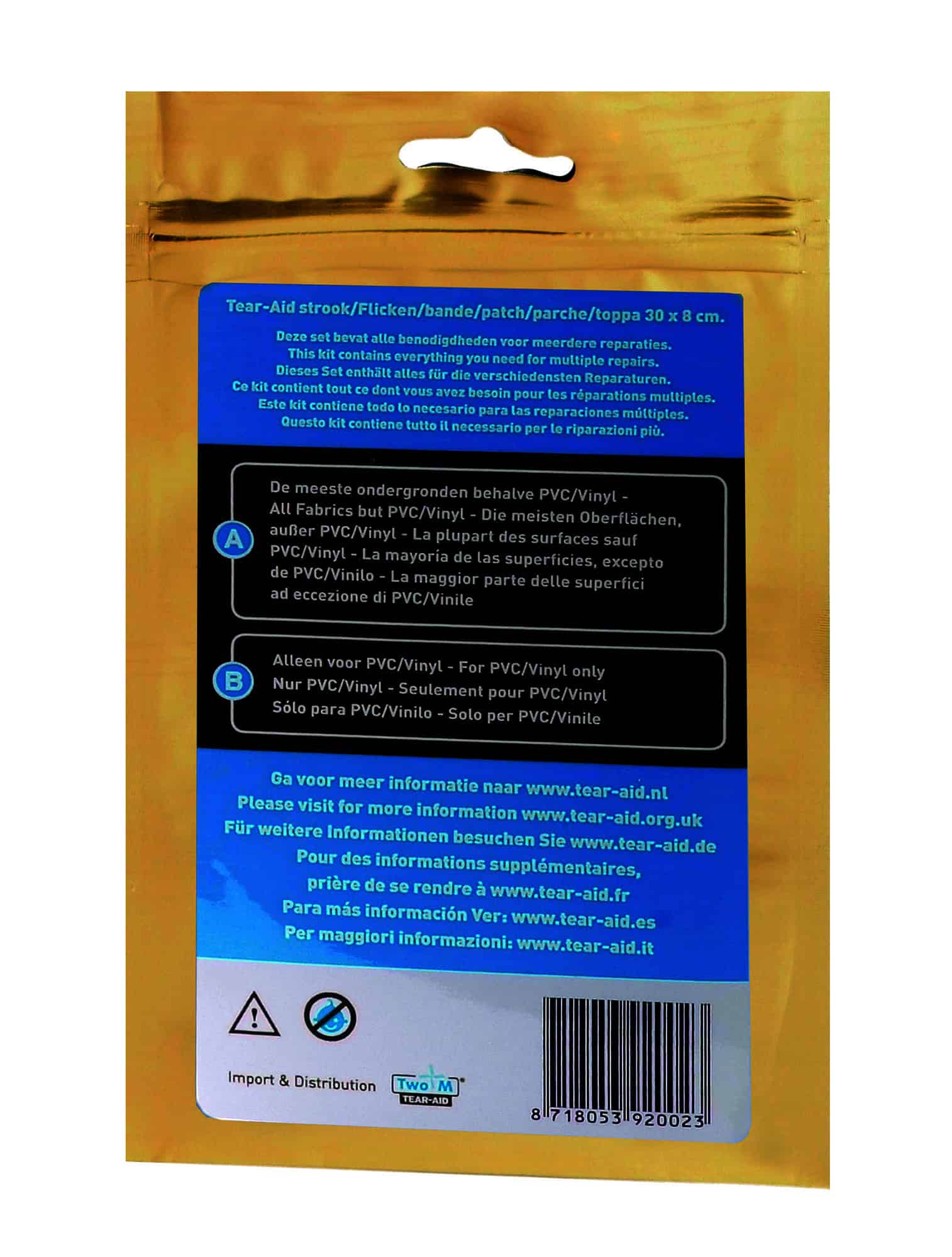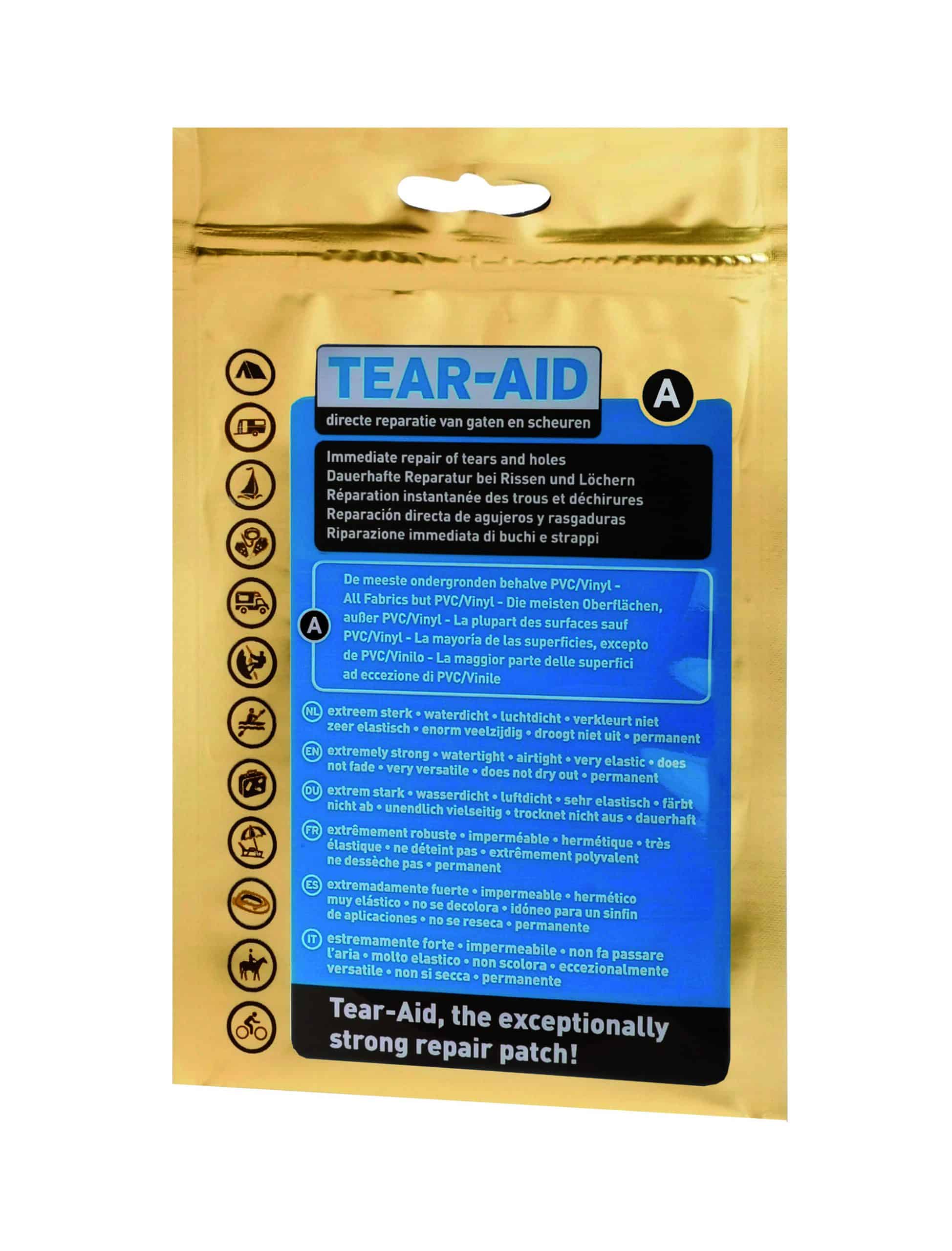 Een veelzijdig en doorzichtig reparatiemiddel, Tear-Aid B, biedt permanente oplossingen voor gaten en scheuren in PVC en vinyl. Dit middel is buitengewoon sterk, water- en luchtdicht, uiterst elastisch, blijft kleurecht en behoudt zijn elasticiteit. Het droogt niet uit en kan zelfs onder water worden toegepast! Perfect voor blijvende reparaties van pvc-tentramen, grondzeilen, opblaasbare boten, zwembaden, zwembanden, opblaasbaar speelgoed, pvc-zonneschermen, parasols, vinyl regenjassen en tassen. De set bevat een strook Tear-Aid reparatietape (30x8cm), een versterkingsdraad (45cm) voor randreparaties, en vier alcoholdoekjes voor het reinigen van het oppervlak.