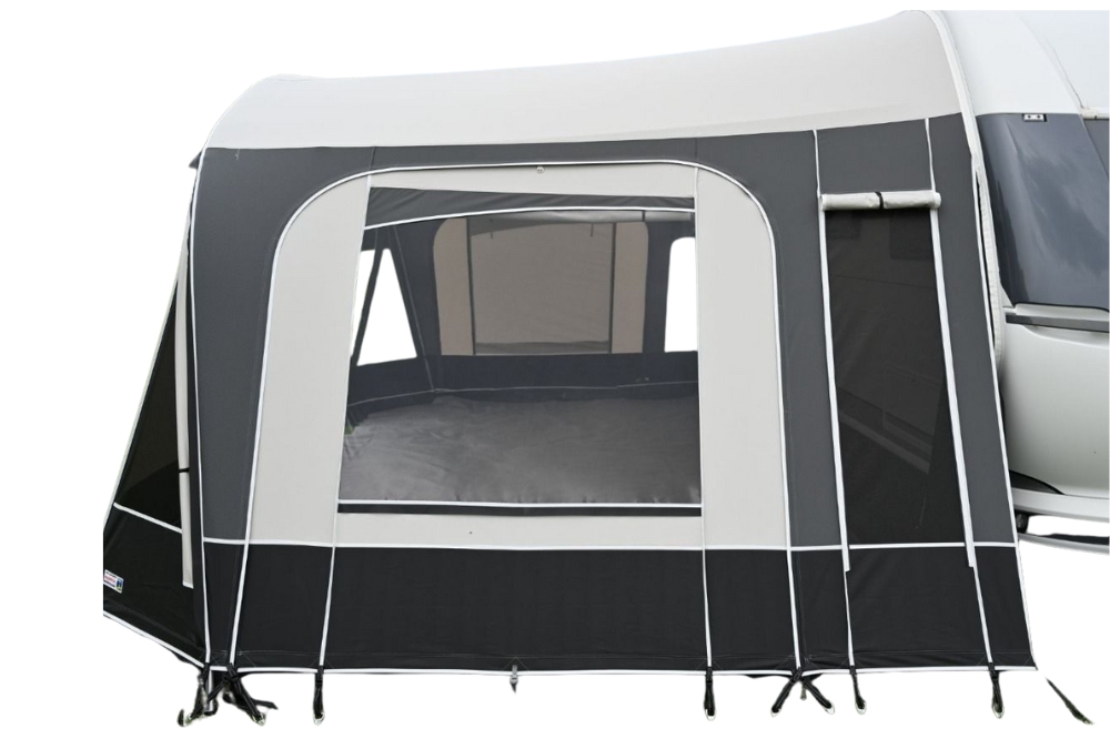 De voortent is vervaardigd uit hoogwaardige en duurzame materialen. Het Ten Cate All Season-doek is sterk, licht en vormvast. In combinatie met de verstelbare aluminium boogstokken en stevige afspansjorbanden staat de tent altijd strak, ook op een ongelijke ondergrond. Bij stormweer kunt u de petluifel afritsen voor extra stabiliteit. Voor langer verblijf of betere ventilatie is de Bologna uit te breiden met een optionele dakluifel. Daarnaast is er nu ook een petluifel van 100 cm diep beschikbaar, wat de tent nog veelzijdiger maakt in gebruik.