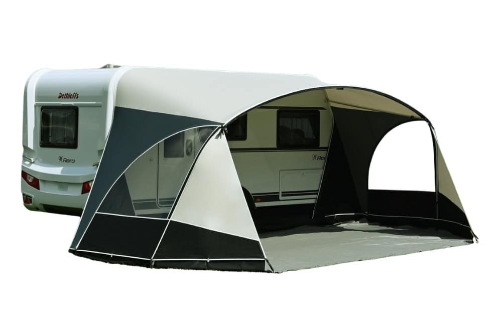 De afneembare slikranden met klittenband zijn praktisch: eenvoudig schoon te maken, apart op te bergen of weg te laten voor extra ventilatie. Aan de achterzijde zit een ritssluiting voor toegang tot het serviceluik, en Quick Lock steunen maken het opzetten extra gemakkelijk. Het gebruikte Ten Cate All Season-doek is sterk, licht en vormvast. Samen met het aluminium frame (30 x 1.4 mm) blijft het totaalgewicht beperkt tot circa 19 kg. Verkrijgbaar in drie moderne kleuren en uitbreidbaar met handige accessoires is de Verona een betrouwbare en veelzijdige luifel voor elke kampeerder.